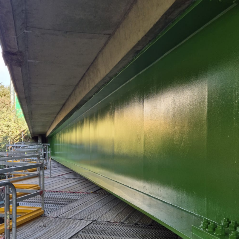 The project was carried out by a Resimac Approved UK Contractor, ensuring expert application of the coating system. The refurbishment process began with thorough cleaning and abrading of the bridge’s steel infrastructure to remove all loose and friable coatings and expose a sound edge. This step ensured a solid foundation for the new protective system.