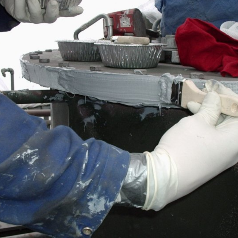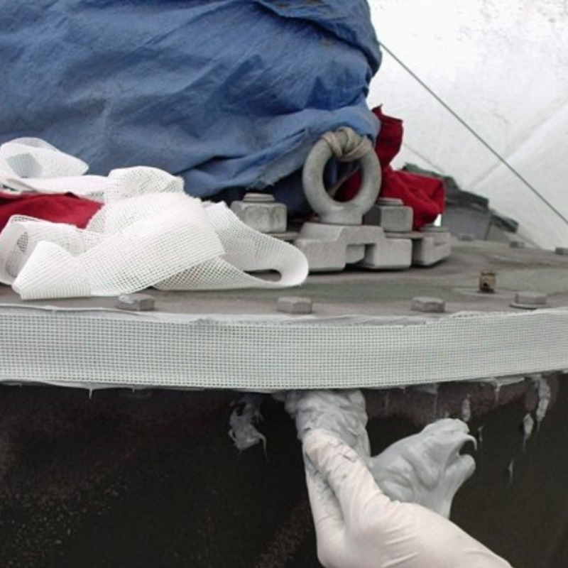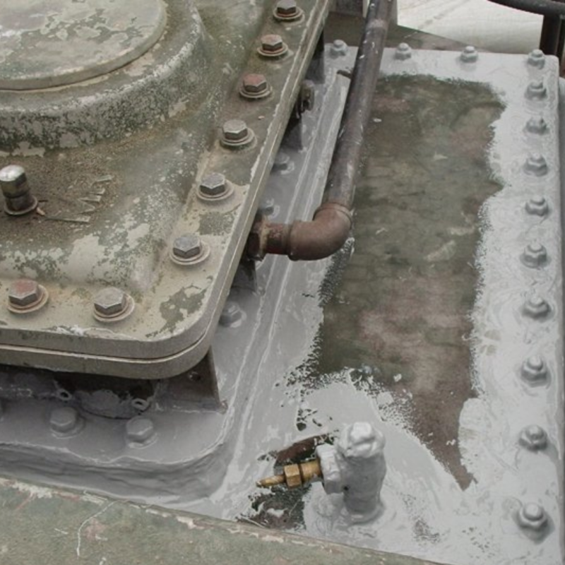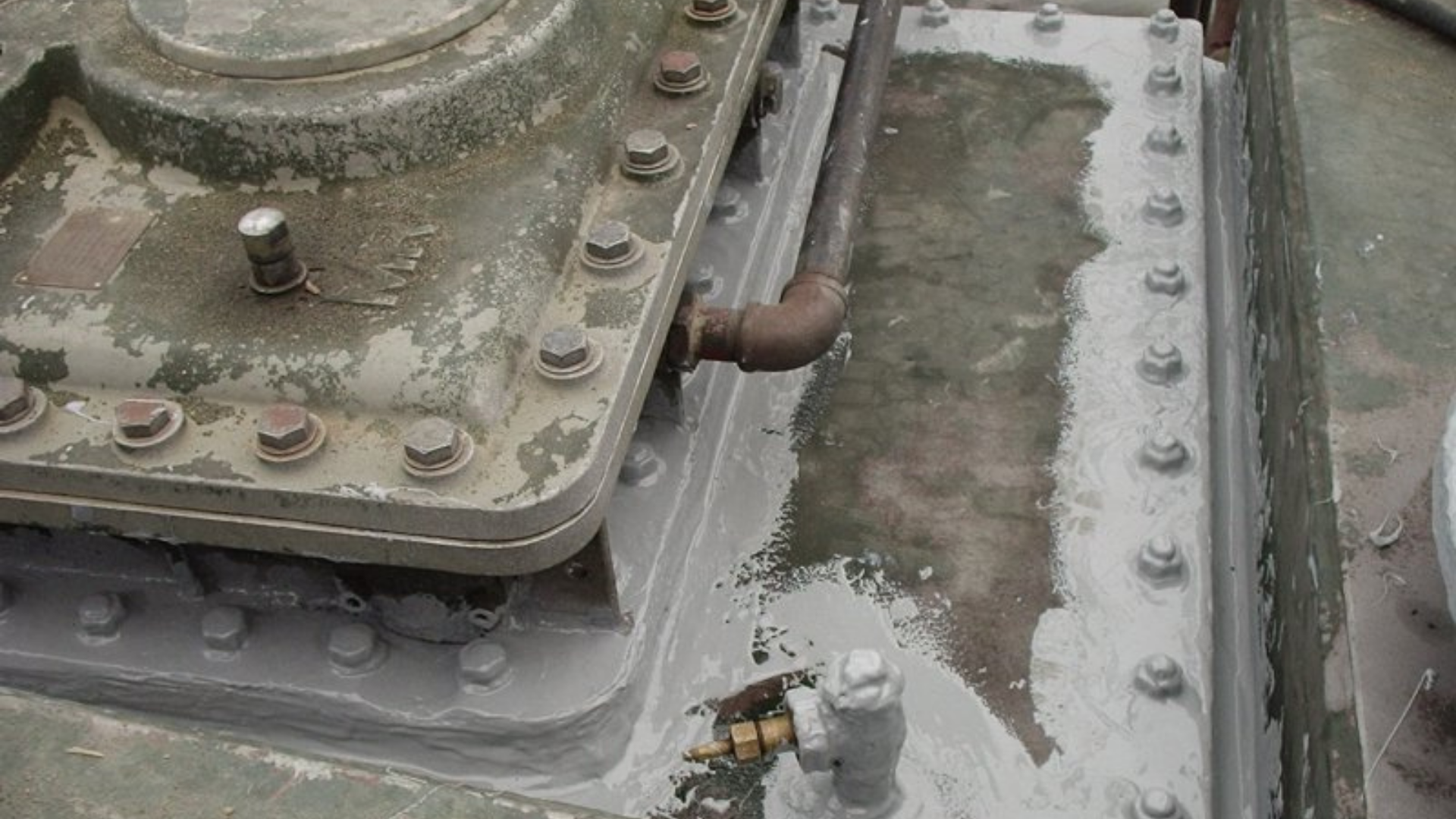 To reinforce the repair, a layer of 808 Reinforcement Tape was embedded within the coating at flange joints and critical areas, enhancing mechanical strength and long term durability. This combination ensured the repaired sections could withstand operational stresses and resist environmental challenges. Finally, all treated areas were overcoated with an additional layer of 104 XF, fully encapsulating the repair and providing robust sealing against oil leakage and water ingress.