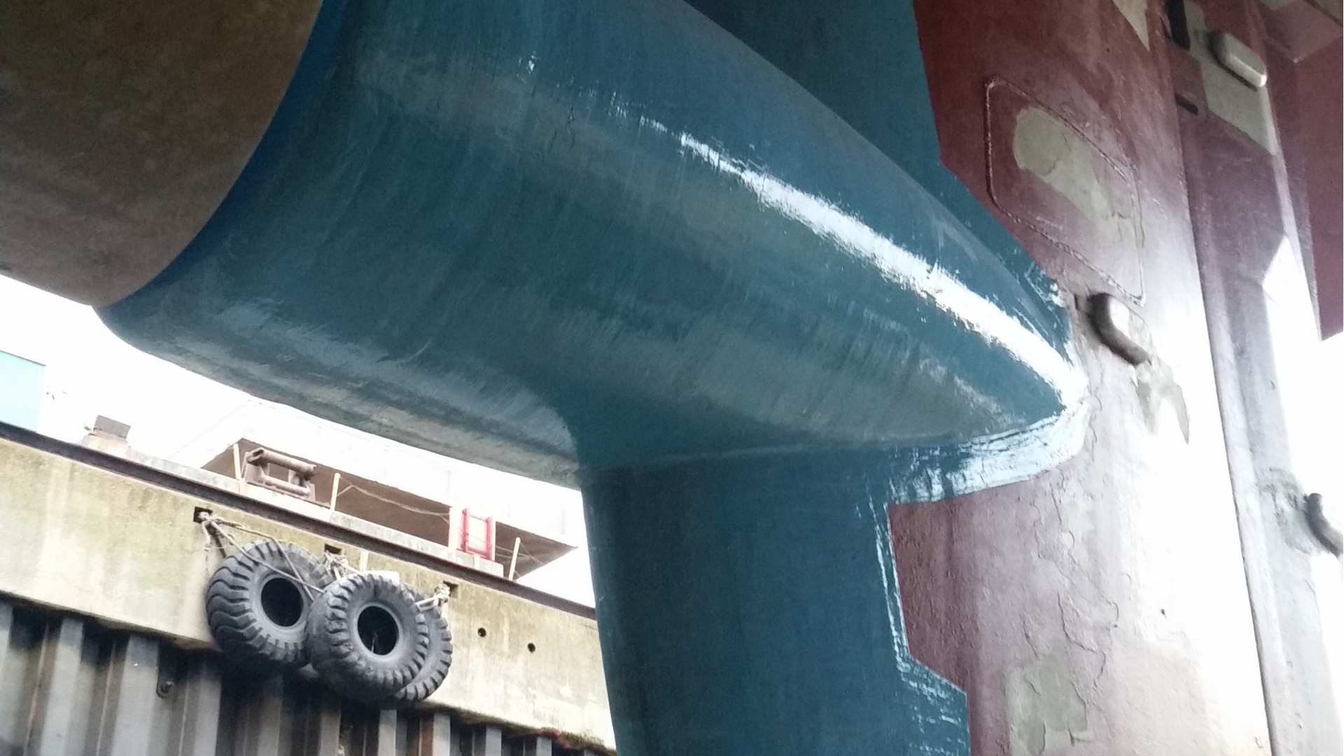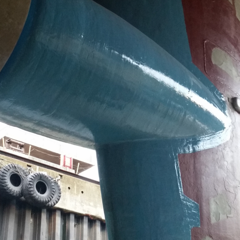 The entire rudder pod was overcoated with two layers of Resimac 203 Super Flow ceramic repair fluid, applied by brush and roller. Each coat was applied to a nominal thickness of 250 microns, forming a durable finish designed to resist future abrasion and corrosion, even in harsh marine environments.