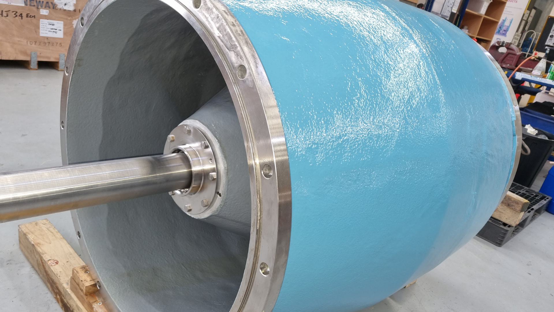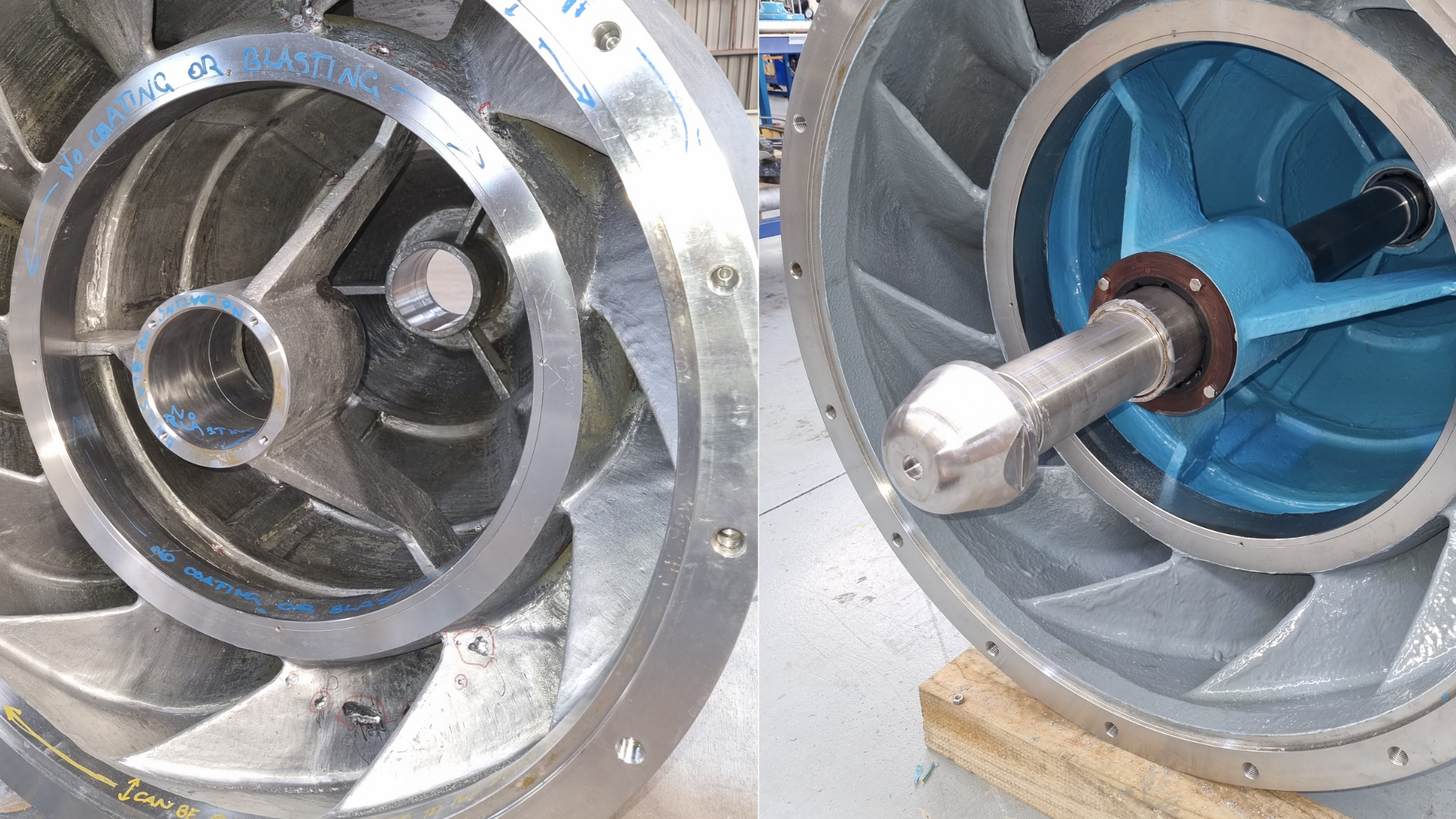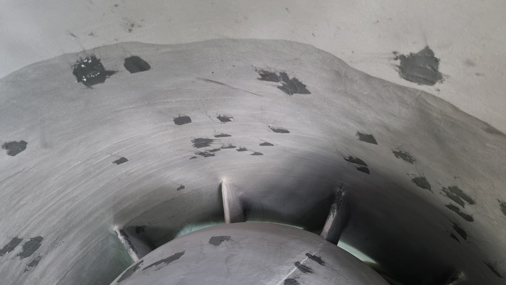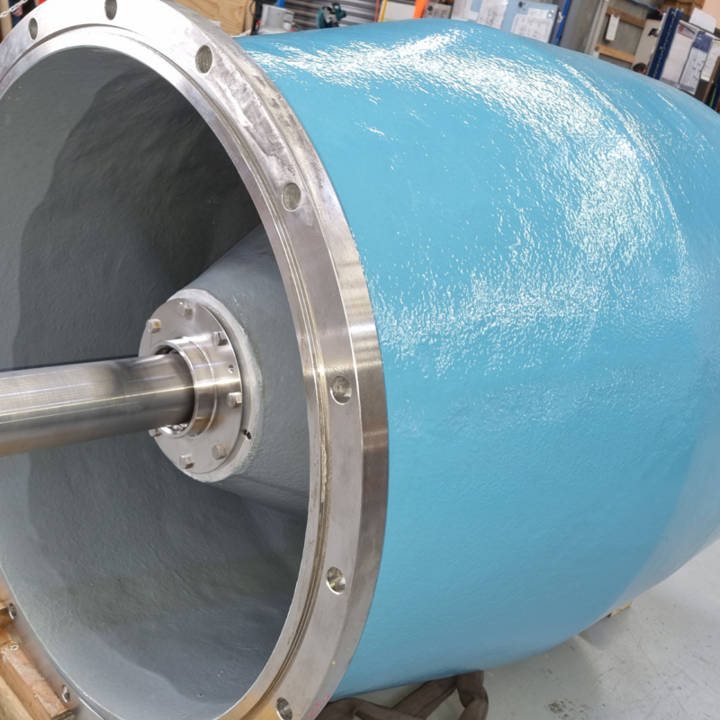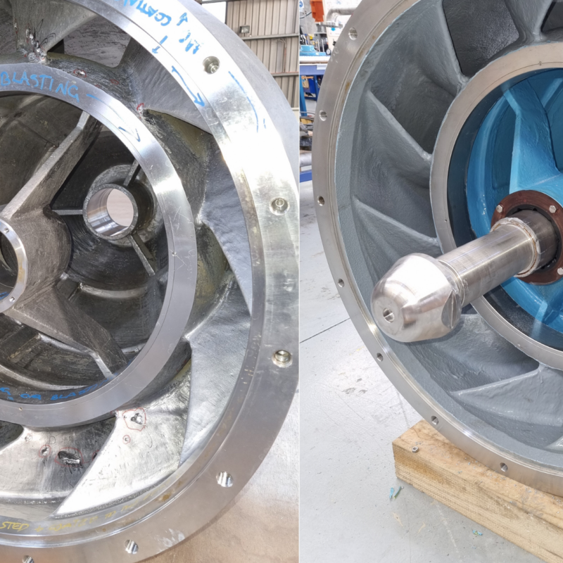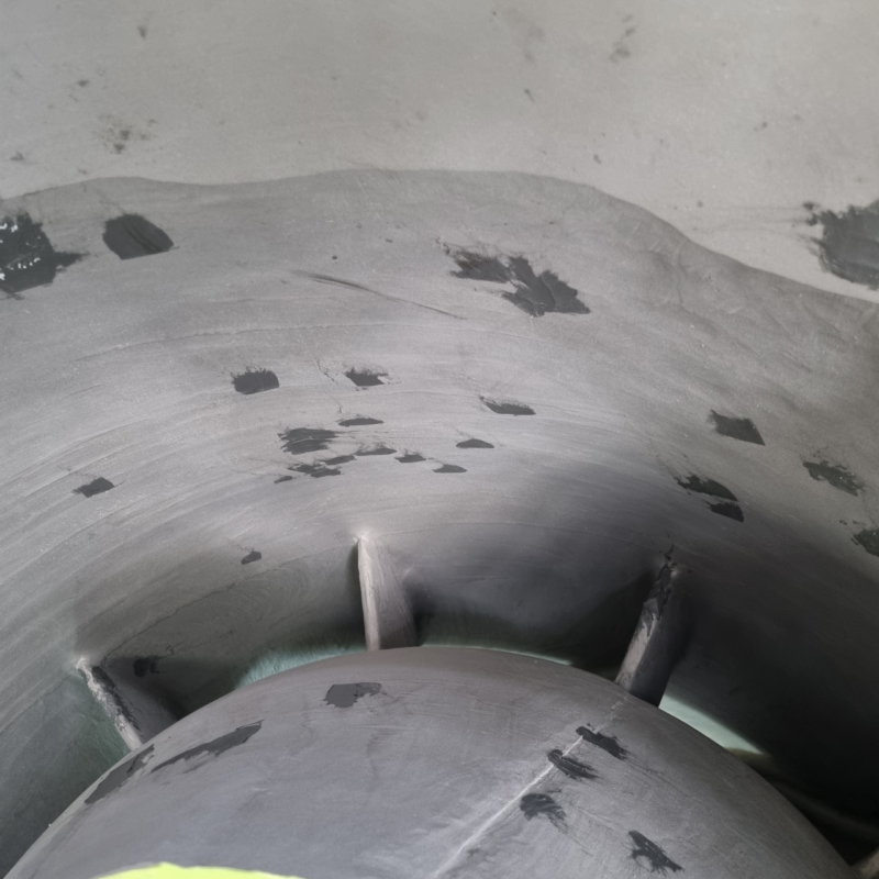 The entire system was thoroughly cleaned to remove contaminants and salt deposits. Abrasive blasting was then carried out to SSPC SP10/NACE 2 (ISO 8504-1 SA 2.5) standards, using non-ferrous aggregate on stainless steel components to prevent contamination. The surface profile allowed for effective bonding of both rebuilding and protective materials.