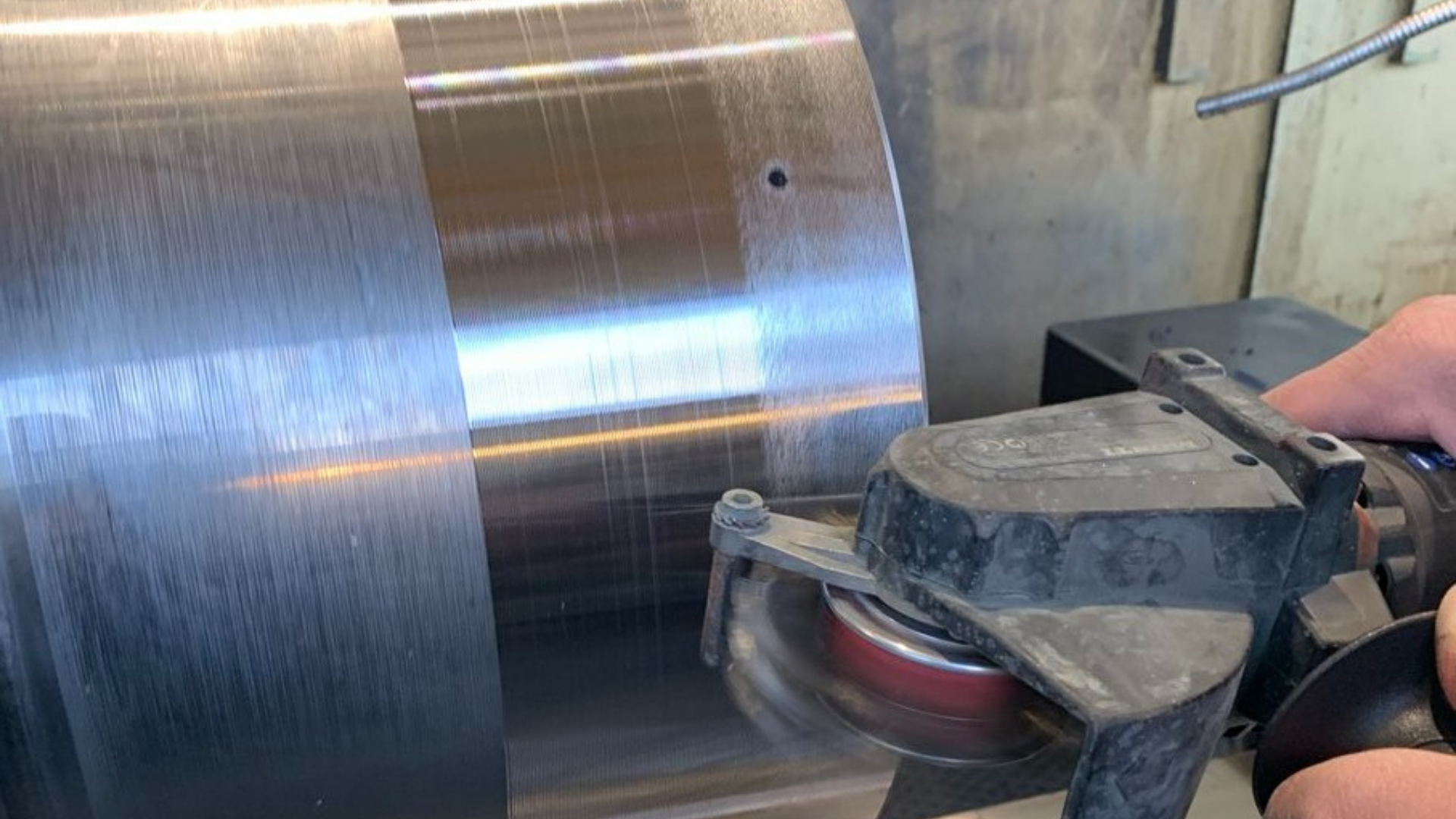 The repair process utilised Resimac 101 Metal Repair Paste, a high performance epoxy system. Preparation began by mounting the shaft on a lathe and scoring the surface to a depth of 1.5–2mm, creating a mechanical profile for maximum adhesion. Technicians then used a bristle blaster to achieve a uniform surface roughness.
